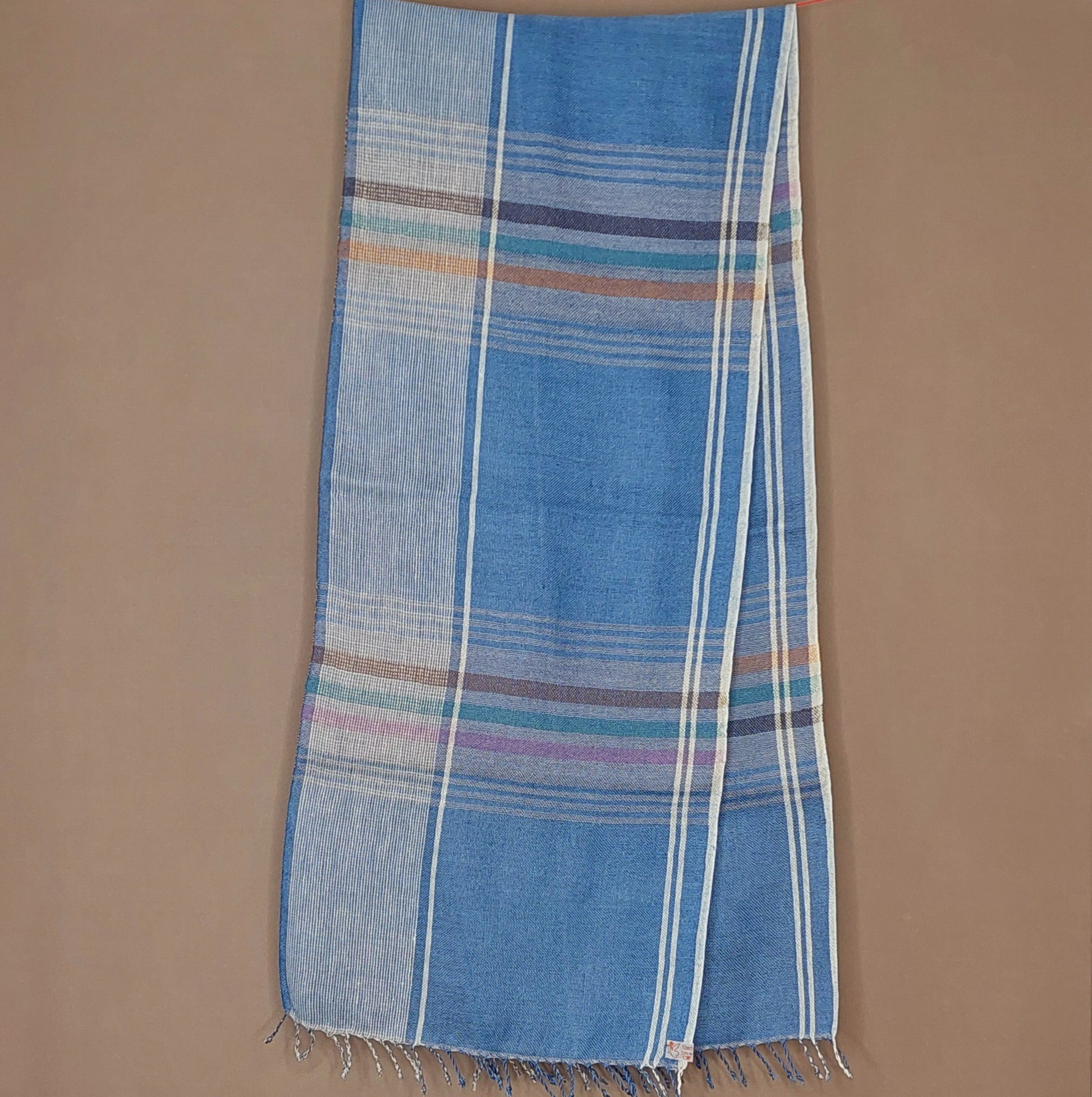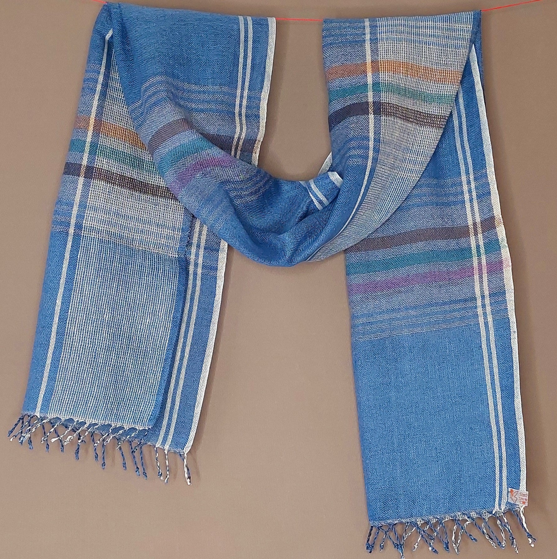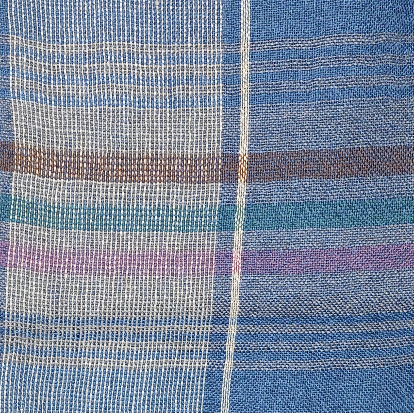 Eleganter, sehr leichter Schal aus Leinen und weicher Merinowolle in Blau mit Hellgrau und dezenten farbigen Streifen, leicht wärmend und feuchtigkeitsregulierend, ideal für Outdooraktivitäten in der Übergangszeit.